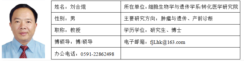 刘合焜,男,1963年10月生,理学博士,博士生导师。1984年南京老员工物系获理学学士学位,1991年南京老员工物系硕士研究生毕业获理学硕士学位,2005年四川大学医学遗传学专业博士研究生获理学博士学位,2010年WilliamHill中文官方网站临床医学博士后流动站出站。现任WilliamHill中文官方网站转化医学研究院副经理,细胞生物学与遗传学系教授,福建省干细胞转化医学协同创新中心副主任兼秘书长,福建省癌症和神经退行性疾病转化研究重点实验室副主任。从事细胞生物学、医学遗传学和肿瘤遗传学的教学和科研工作,尤其肿瘤遗传、遗传病、产前诊断等医学遗传学和分子遗传学研究。2002年9月至2006年2月先后在人类疾病生物治疗国家重点实验室疾病基因组研究室、国家人类基因组北方研究中心、农业生物技术国家重点实验室“畜禽基因组与分子数量遗传学创新研究群体”从事博士研究和国内访问学者。2010年和2016年两次在美国哈佛医公司卢坤平教授实验室访问学者。