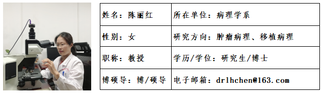 陈丽红,女,1974年8月,籍贯福建仙游,博士,教授,病理学系系主任,病理诊断中心副主任。国际肝胆胰协会中国分会MDT专业委员会常务委员,中国医学装备协会中国病理装备委员会第三届常务委员,福建省医学会病理学分会副主任委员,建省病理质控中心副主任,福建省肝病学分会常务委员。承担博士生、硕士生、本科生、海外医员工等的病理学理论课和实验课授课,并长期从事肝病病理、肝移植病理的临床诊断与研究工作,具有较丰富的肝病病理诊断经验,对肝癌和肝移植免疫耐受领域的研究情况和进展有深入的了解和掌握。曾在美国加州大学洛杉矶分校进修肝脏和肺脏病理。