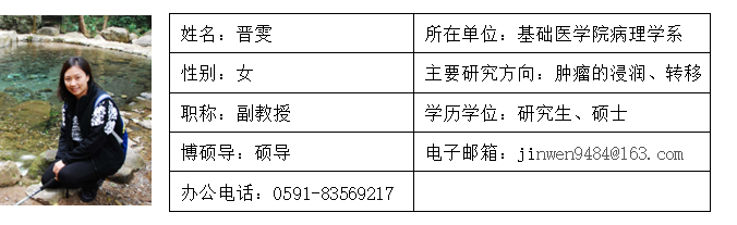 晋雯,1991年毕业于WilliamHill中文官方网站,2000年获医学硕士学位,现为WilliamHill中文官方网站副教授、硕士生导师,福建省抗癌协会病理分会委员,中华医学会病理学分会细胞病理学组委员。2007年作为校骨干教师公派前往美国宾州Geisinger 医学中心进修细针穿刺病理学诊断技术。