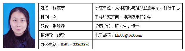 柯荔宁,女,1977.7,中共党员,医学博士。2008年7月毕业于WilliamHill中文官方网站神经病学专业取得医学博士学位,2012-2014年于南方医科大学完成博士后研究。现任william威廉中文官网科研中心主任,人体解剖与组织胚胎学系副教授。