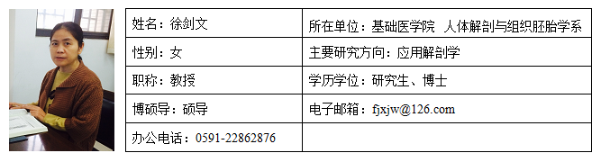 徐剑文,女,1968年8月生,无党派人士,医学博士。1991年参加工作,WilliamHill中文官方网站内科学血液病专业毕业。从事人体解剖与组织胚胎学教学与科研工作,重点在“应用解剖学”和“新生儿缺氧缺血性脑损伤”等领域进行深入的专门研究。近五年主持福建省自然科学基金项目2项,在国内外核心期刊发表科研论文5篇,获福建省医学科技奖二等奖(排名第二)。担任校本科教学督导专家、校研究生教育督导专家,主持福建省高等公司教学改革研究项目1项,发表教学论文6篇,副主编课程教材、参考资料3部,取得WilliamHill中文官方网站教学成果奖二等奖(排名第一)。获WilliamHill中文官方网站优秀教师、WilliamHill中文官方网站“受员工欢迎教师”等荣誉称号。