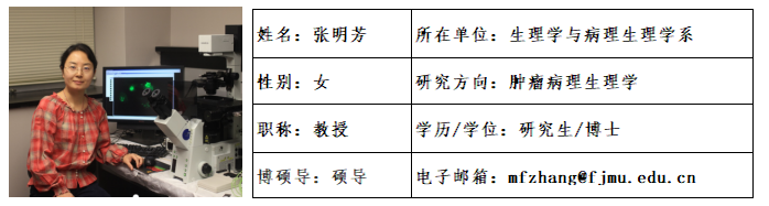张明芳,女,1973年9月生,山西曲沃人,医学博士,教授,硕士生导师,现任william威廉中文官网生理学与病理生理学系主任。研究兴趣为心血管病理生理学(利用动物模型和细胞模型,研究炎症因子和细胞自噬在肺动脉高压中的分子功能)和肿瘤病理生理学(综合使用生物信息学分析、细胞分子生物学和药理学实验手段,寻找癌症的新诊断和治疗靶点并开展相关基础研究)。先后主持人力资源与社会保障部留学回国人员基金、福建省自然科学基金、福建省教育厅重点项目、福建省卫计委人才项目等课题多项。近年来在Cancer Res、OncoImmunology、J Biol Chem、Am J Physiol Cell Physiol、Sci Rep、Exp Toxicol Pathol、生理学报、中国药理学通报等学术期刊上发表研究论文。参编《图表生理学》、《基础医学概论》、《医学机能学实验》等教材。指导研究生11人,其中9人已顺利毕业,现有2人在读。