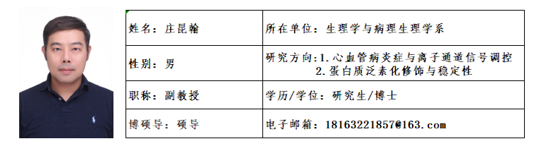 庄昆翰(Kun-Han Chuang),男,1979年7月生,理学博士,副教授,硕士生导师。2013年于台湾阳明大学医公司获得生理学专业理学博士学位。2014年至2018年期间,曾在美国佛罗里达州立大学、杰克森实验室和美国国立卫生研究院担任博士后研究员。2021年至2022年赴美国乔治华盛顿大学作为访问学者。2022年取得美国临床病理学会(ASCP)分子生物学技术认证。目前的研究重点为:(1) 探索心血管病炎症微环境与血管平滑肌细胞内离子信号之间的调控机制,寻找潜在药物靶点;(2) 研究Hedgehog信号通路核心分子的泛素化修饰及其蛋白质降解机制。至今共发表学术论文15篇,其中以第一作者或通讯作者身份发表7篇,在SCI收录期刊中发表13篇,包括Cell Reports、Elife、Hypertension、JCI Insight等一区期刊。主持过多项省部级和校级科研项目,并担任Journal of Pharmaceutics & Drug Delivery Research、OncoTargets and Therapy、Frontiers in Nutrition、Frontiers in Immunology、Bioinformatics and Biology Insights等多本国际期刊的审稿人及编委。已指导3名研究生及4名本科生。热忱欢迎对学术研究有兴趣的同学加入团队。