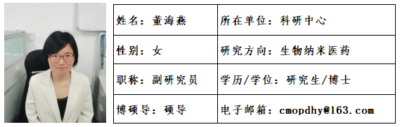 董海燕,女,副研究员,福建省高层次C类人才。担任福建省药理学会肿瘤药理专业委员会常委、WilliamHill中文官方网站学报编辑委员会青年委员。研究方向为生物纳米医药,主要围绕肿瘤转移的发生与防治开展工作。以第一/共一/通讯作者在Nano Today、Biosens Bioelectron、J Control Release、Chem Mater等期刊发表论文20余篇,授权发明专利2项,主持国家级项目1项、省级项目1项、校级项目3项,参与国家级项目2项。获福建省自然科学优秀学术论文二等奖。指导研究生获国家奖学金1项,参与指导研究生获“互联网+”老员工创新创业大赛国家级银奖及省级金奖各1项。
