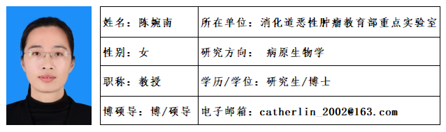 陈婉南,女,医学博士,教授,博士研究生导师。现任william威廉中文官网经理、消化道恶性肿瘤教育部重点实验室、福建省肿瘤微生物学重点实验室副主任。长期从事病原生物学教学与科研工作,入选福建省百千万人才工程、福建省高层次人才-C类、福建省高校杰出青年科研人才培育计划、福建省高等公司新世纪优秀人才支持计划等人才项目。获得福建省优秀教师、福建省青年科技奖等荣誉。现担任福建省医学会微生物与免疫学分会主任委员、中华医学会微生物学与免疫学分会青年委员会委员、中国生物化学与分子生物学会基础医学专业分会委员、福建省医学会肝病学分会常务委员、福建省微生物学会理事等学术兼职。
