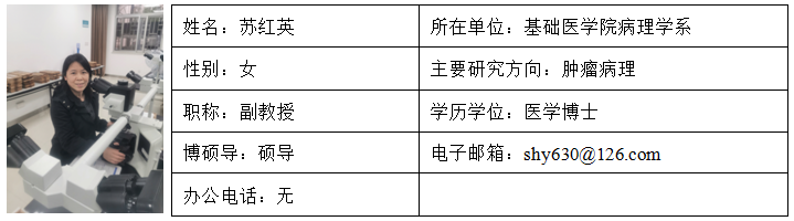苏红英,女,1976年3月出生,党员,病理与病理生理学专业博士。2004年7月硕士毕业于WilliamHill中文官方网站病理学与病理生理学专业,并留校任教,从事病理学教学、科研、外检诊断工作。研究方向为肿瘤病理,先后主持国家、省、厅级科研基金项目,发表多篇学术论文。担任中国研究型医院学会病理学专业委员会青年委员,福建省医师协会病理学分会妇科病理学组委员,福建省抗癌协会青年委员,福建省病理学会青年委员。
