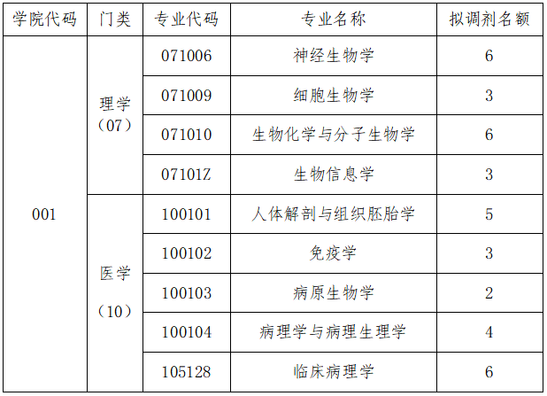 6.因专业属性要求,基础医学专业(1001)只接受初试志愿报考医学门类(专业代码10开头)的调剂生;生物学专业(0710)只接受初试志愿报考专业为理学门类(专业代码07开头)的调剂生;临床病理学专业(105128)只接受初试志愿报考临床医学专业学位(专业代码1051开头),且初试成绩总分达315分、单科(满分=100分)达45分、单科(满分>100分)达135分调剂生。