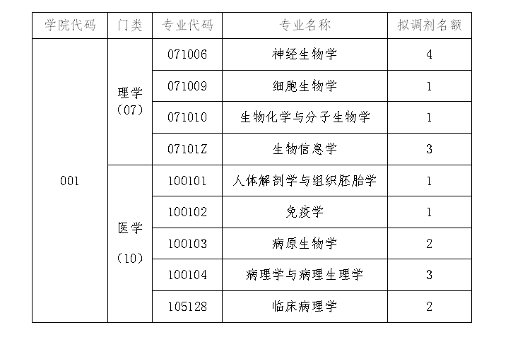 6.因专业属性要求,基础医学专业(1001)只接受初试志愿报考医学门类(专业代码10开头)的调剂生;生物学专业(0710)只接受初试志愿报考专业为理学门类(专业代码07开头)的调剂生;临床病理学专业(105128)只接受初试志愿报考临床医学专业学位(专业代码1051开头),且初试成绩总分达315分、单科(满分=100分)达45分、单科(满分>100分)达135分调剂生。