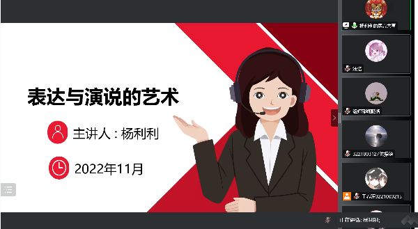 2022年11月5日下午,william威廉中文官网团委组织部举办了团委、员工会新成员培训班第三讲--表达与演说的艺术。此次培训采取线上宣讲的模式,邀请了国家三级心理咨询师杨利利老师来为william威廉中文官网团委、员工会的新成员进行表达方面的培训。