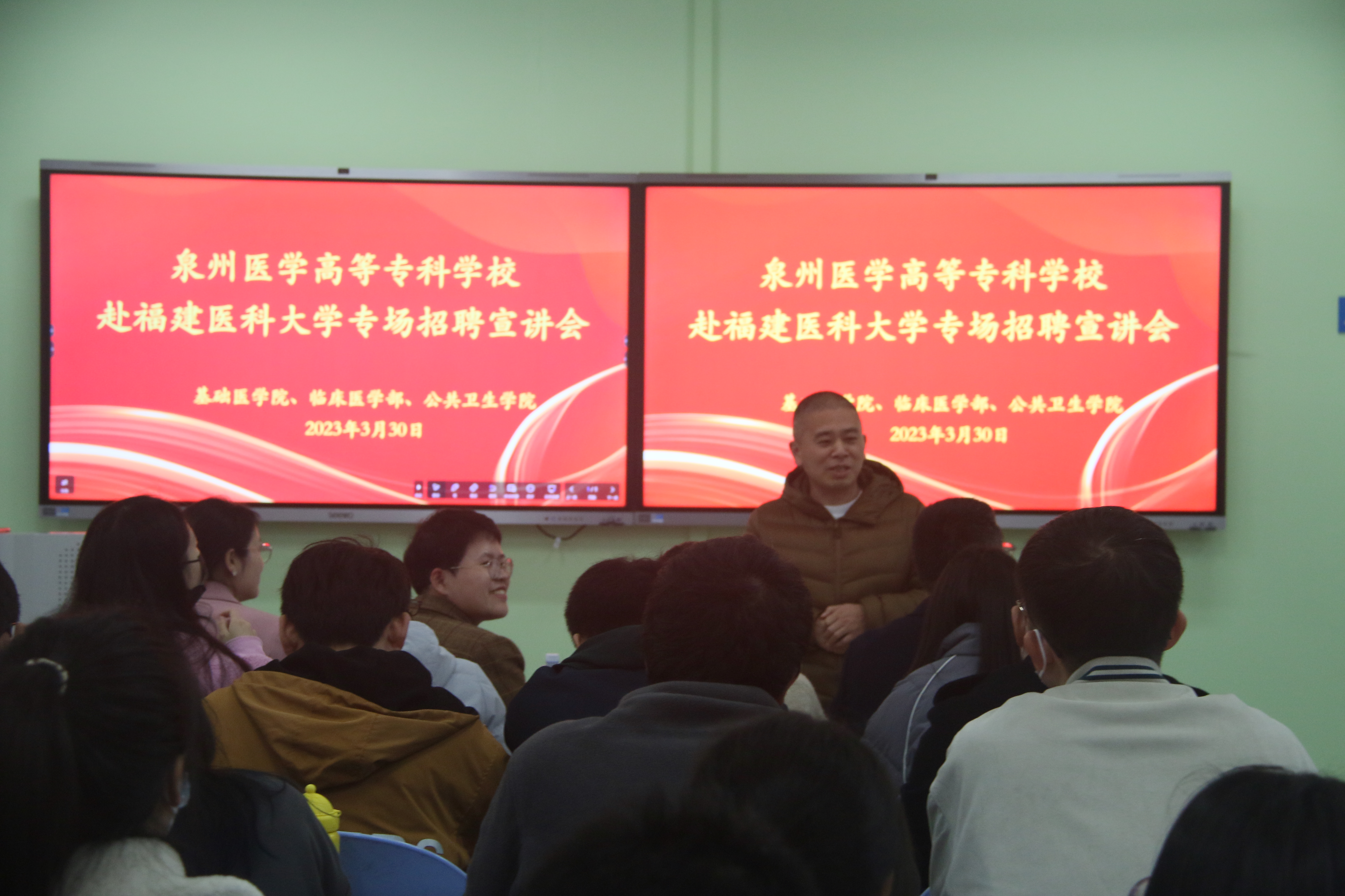 2023年3月30日下午,公司联合临床医学部、公共卫生公司在旗山校区第69教室,邀请泉州医学高等专科公司等单位来校进行校园宣讲和现场招聘。校员工工作处副处长曾银花、公司党委书记郭松斌、经理陈婉南参加。