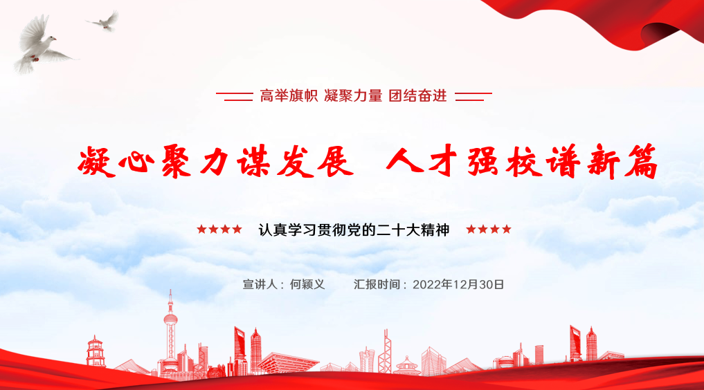 何颖义以凝心聚力谋发展,人才强校谱新篇》为主题作宣讲报告,他从党的二十大关键词、人才工作举措与成效、人才工作面临的主要问题及人才工作建设的重点任务几个方面进行了深入解读。何书记指出,要积极践行党的二十大精神,推动集团人才强效落地,强化服务,推动新时代高校人才工作迈上新台阶。