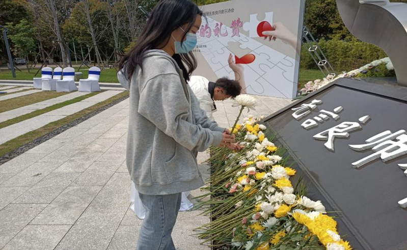 【图为2021级临床医学第二团支部成员于无言良师碑前献花】
