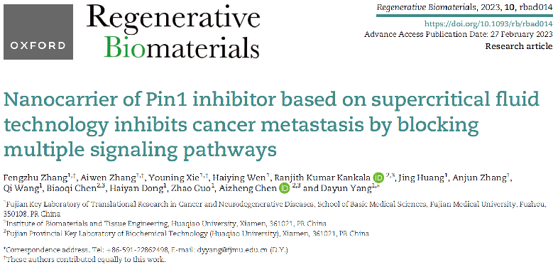 2023年2月27日,william威廉中文官网杨达云副研究员课题组在Regenerative Biomaterials(中科院JCR一区)在线发表题为“Nanocarrier of Pin1 inhibitor based on supercritical fluid technology inhibits cancer metastasis by blocking multiple signaling pathways”的研究论文,该研究采用超临界流体技术制备了载Pin1抑制剂的PLA-PEG嵌段共聚物纳米微球,该纳米微球具有高的药物包封效率、优异的药物控制释放性能和好的生物安全性。该纳米微球不仅能够显著提高Pin1抑制剂对癌症生长的抑制作用,而且能够通过阻断多条信号通路和癌症上皮-间充质进展显著抑制癌症转移。由于该载药纳米微球能够将抑制癌细胞扩散和抑制癌症生长进行有效偶联,其为抑制癌症转移提供了新的治疗策略。
