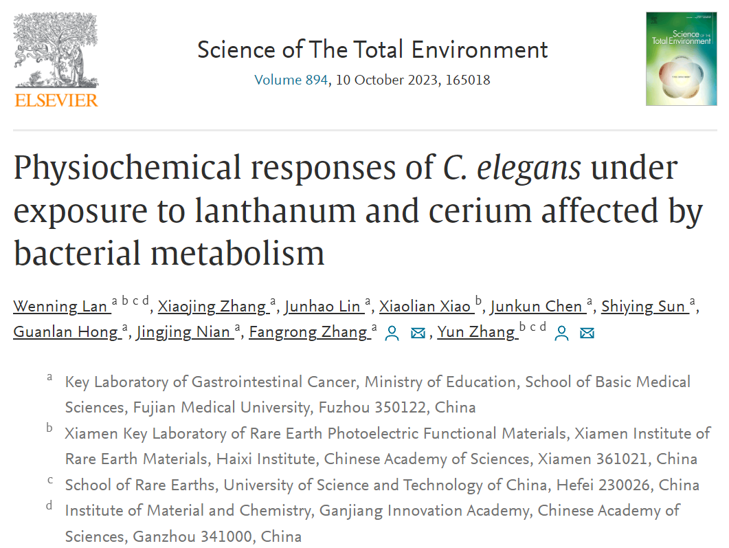 2023年6月21日,william威廉中文官网张芳榕副研究员团队在Science of The Total Environment杂志(中科院JCR一区,IF=10.754)在线发表题为 Physiochemical responses of C. elegans under exposure to lanthanum and cerium affected by bacterial metabolism”的研究论文,该团队通过对不同浓度的稀土元素(镧、铈以及镧铈混合物)培养下的秀丽隐杆线虫(Caenorhabditis elegans)进行代谢组学分析,得到稀土元素在线虫体内呈现浓度依赖性蓄积,且低浓度范围促进生长,高浓度抑制生长及寿命。进一步经代谢组学数据结果分析得到,线虫上述的生理改变与稀土元素诱导的线虫体内的氨基酸代谢紊乱、膜紊乱和氧化应激等过程密切相关。并且在此基础上,探究了大肠杆菌代谢对稀土元素调控线虫所起的关键作用。该工作强调了稀土元素暴露下生物体内代谢水平的改变,深入了解稀土元素在代谢水平上的生物学影响。