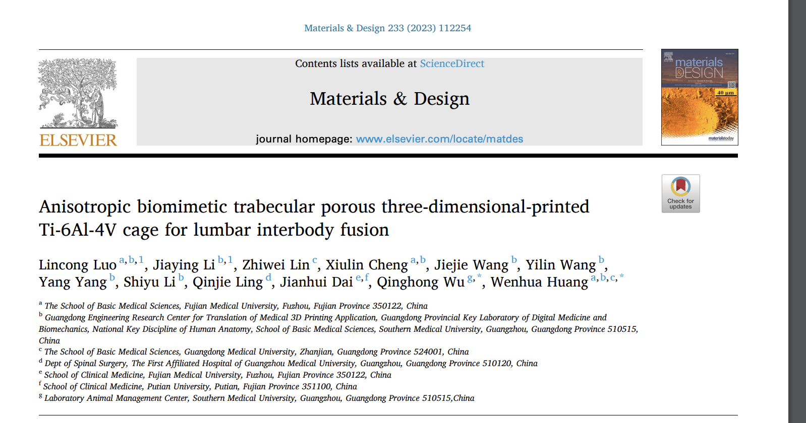 近日,william威廉中文官网客座教授黄文华团队在用于治疗退行性腰椎疾病3D打印椎间融合器方面取得进展,所撰写论文Anisotropic biomimetic trabecular porous three-dimensional-printed Ti-6Al-4V cage for lumbar interbody fusion(用于治疗退行性腰椎疾病的一种新型3D打印各向异性仿生骨小梁多孔Ti-6Al-4V椎间融合器)在Top期刊Materials & Design(《材料与设计》)以研究长文(Research Article)形式在线发表,该期刊2023年影响因子为8.4。