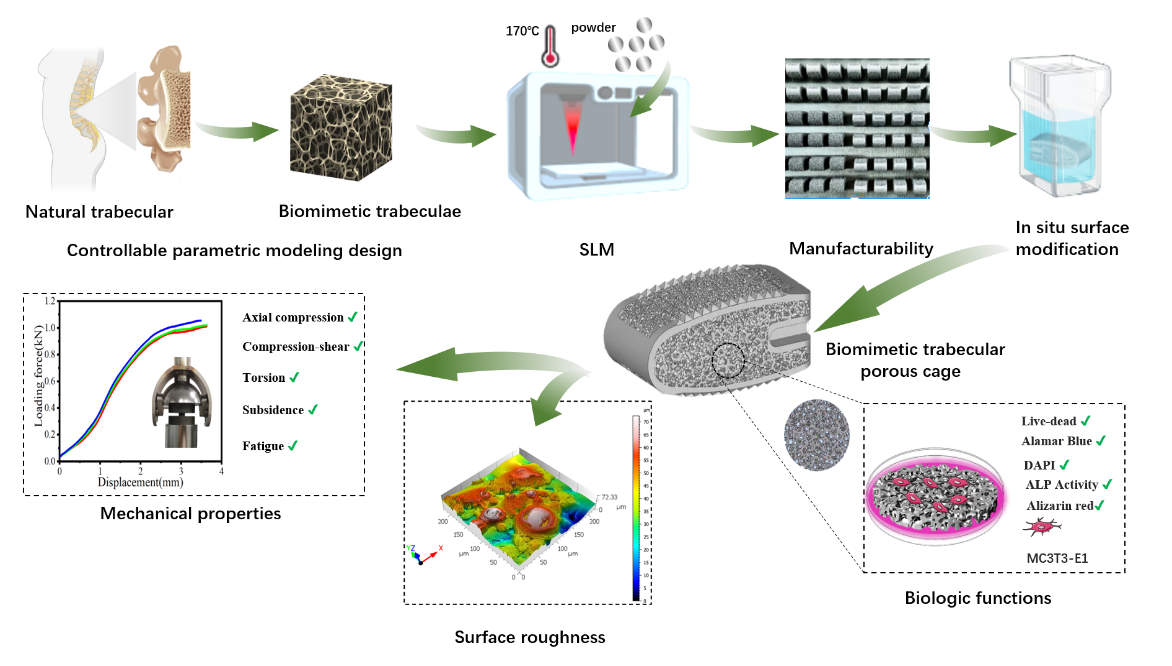 下腰痛(LBP)是一种常见的临床症状,通常由椎间盘退变引起,大约60%-80%的人在一生中经历过下腰痛,严重影响生活质量。椎间融合术是一种治疗腰椎疾病的外科手术,通过椎间融合器植入物替换受损的椎间盘来恢复脊柱的稳定性和功能。然而,传统的椎间融合器在生物相容性、成骨诱导性和力学性能等方面存在局限性,可能会影响融合效果,并导致椎间融合器松动、下沉和不融合等并发症。因此,迫切需要研发一种新型椎间融合器来克服现有融合器的不足。黄文华教授团队利用可控参数建模技术,根据人体骨小梁的形态和结构特征开发了一种无需植骨融合的3D打印各向异性仿生骨小梁多孔Ti-6Al-4V椎间融合器,并对其表面进行原位修饰,形成微纳米粗糙度,模拟天然骨组织的宏-微观结构,以改善现有椎间融合器的不足,降低术后并发症的发生率。通过一系列的定性、定量实验验证了该新型椎间融合器,具有宏微观个性化各向异性仿生骨小梁的结构特征,显示出优异的力学性能、生物功能和生物相容性。本研究的新型无需植骨融合的3D打印各向异性仿生骨小梁多孔Ti-6Al-4V椎间融合器,在器械植入物方面具有良好的临床应用前景和转化潜力。
