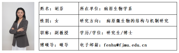 胡芬,女,1987年11月生,湖北汉川人,博士学位,副教授。主要研究方向为病原微生物相关蛋白的结构与机制研究。近五年来以第一作者/共同第一作者在Journal of Biological Chemistry、Chemical Communications、Colloids and Surfaces B: Biointerfaces、Biochem Biophys Res Commun 上发表4篇SCI论文。主持国家自然科学基金青年项目1项、福建省科技厅自然科学基金项目(面上)1项、省教育厅高校青年自然基金重点项目1项、福建省药物靶点发现与结构功能研究重点实验室开放课题1项。