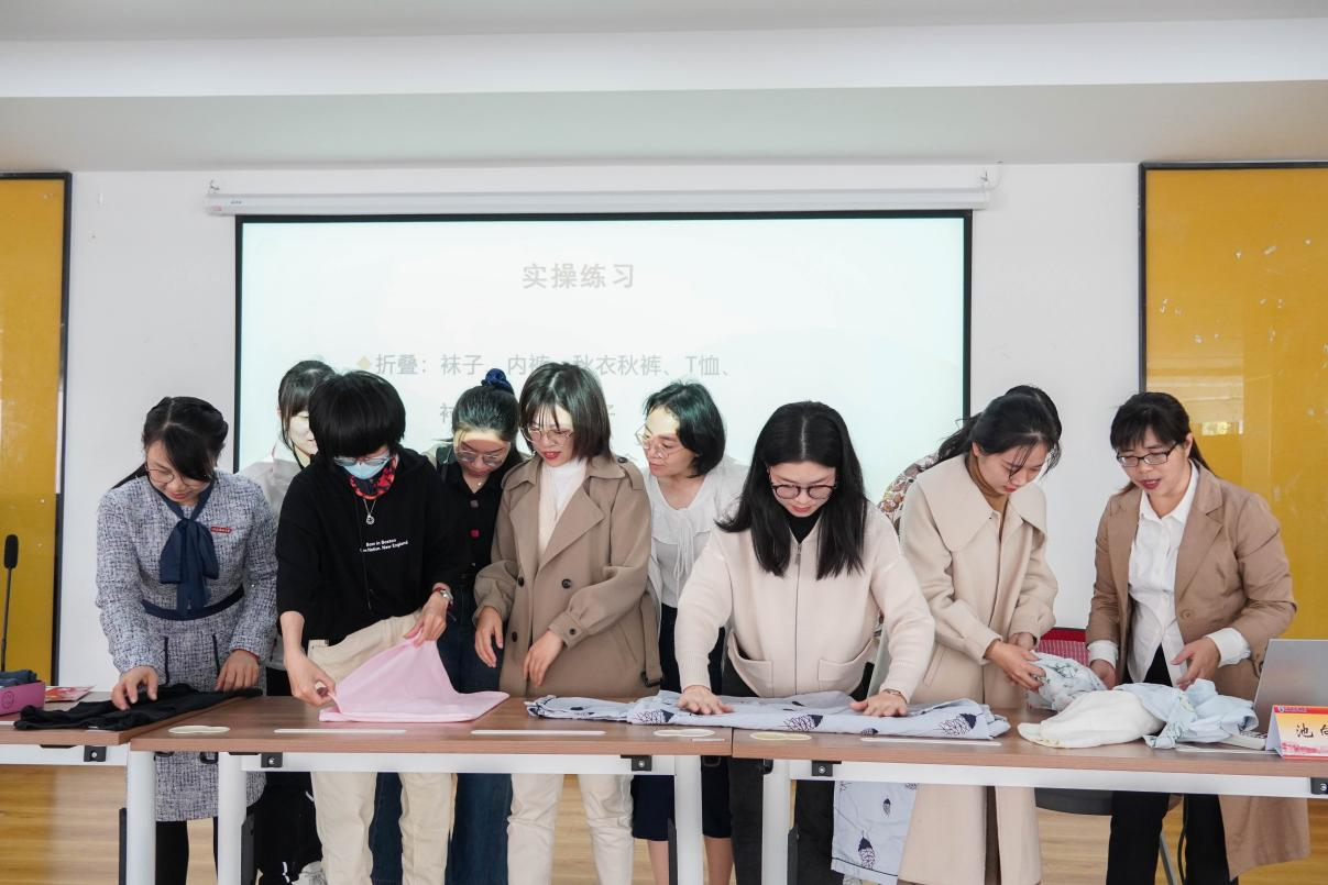 在实操演练环节,池老师邀请师生们上台进行实操。在池老师的指导下,师生们成功将衣物、袋子等整齐地收纳在小盒子里,完成了对物品的收纳。通过对收纳的亲身实践,师生们进一步提高了空间利用能力。