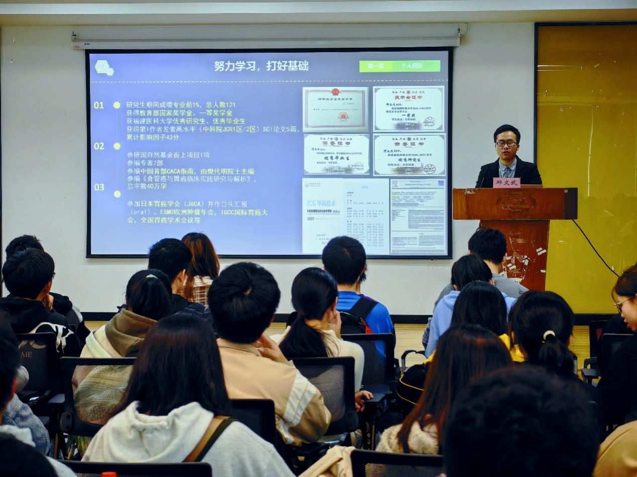 邱文武学长从自身的入党初心和成长经历出发,讲述了本硕博的医路历程,分享了对于临床实践和创新创业的思考和经验。在分享中,邱文武学长传递出积极向上的榜样力量。