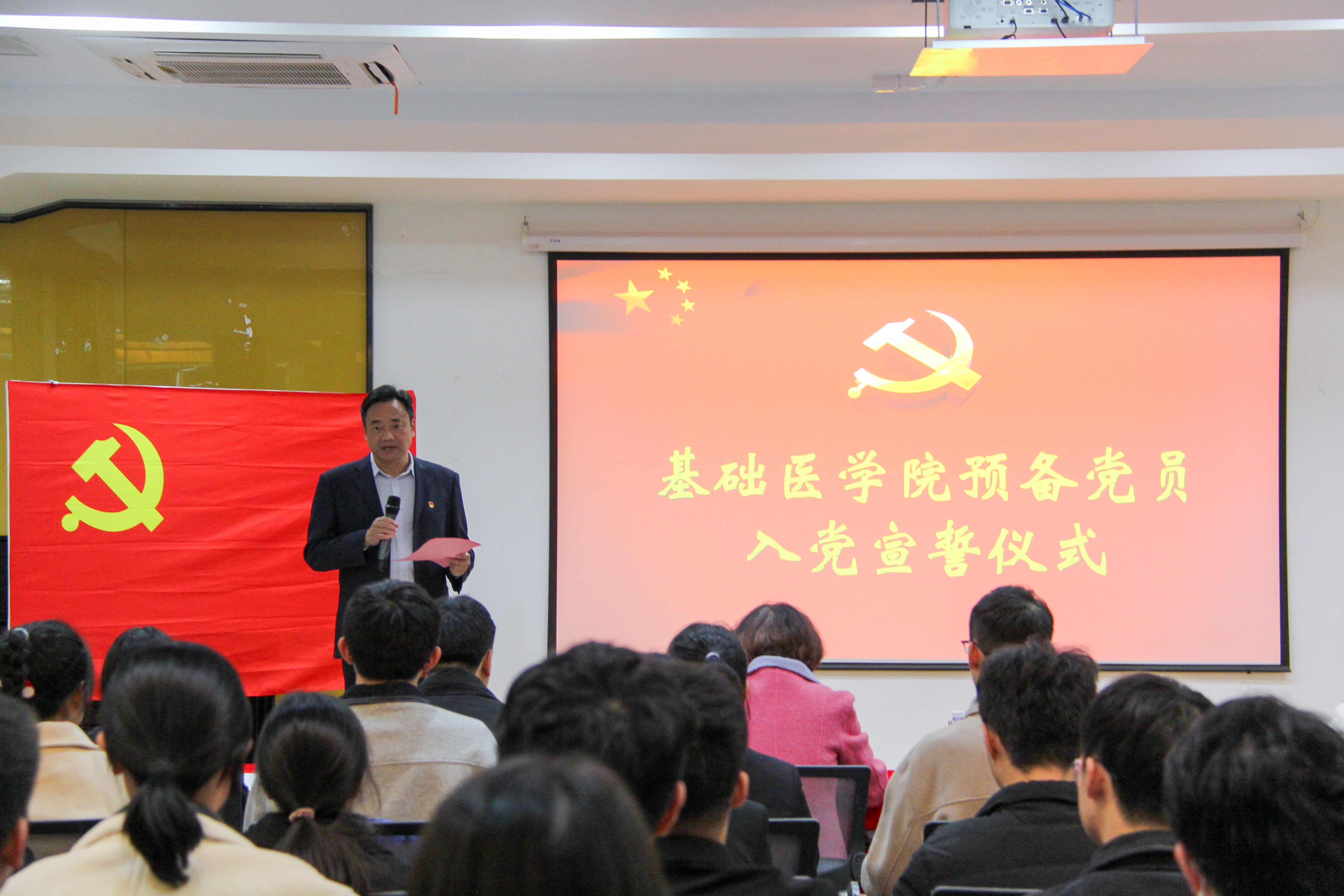 仪式在国际歌中拉开序幕,郭书记、高书记为预备党员佩戴党徽,并发放党章。“我志愿加入中国共产党……随时准备为党和人民牺牲一切,永不叛党。”面对党旗,预备党员在郭书记的领誓下,举起右拳庄严宣誓,表达了对党的忠诚和为共产主义事业奋斗终身的坚定决心。
