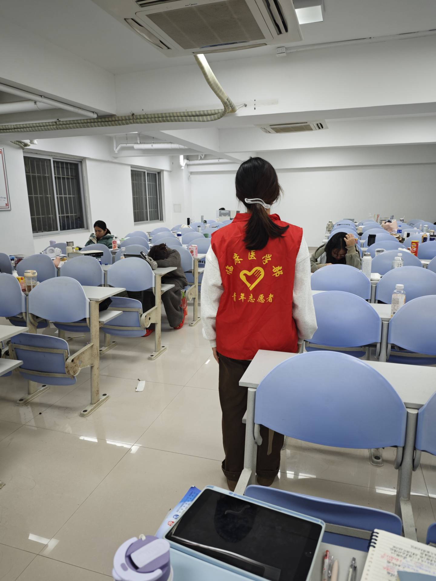 在自习室,队员们及时清理堆放在角落的杂物,每日打扫卫生,引导同学们不占座,规范安全用电,自觉自律,养成良好文明习惯。