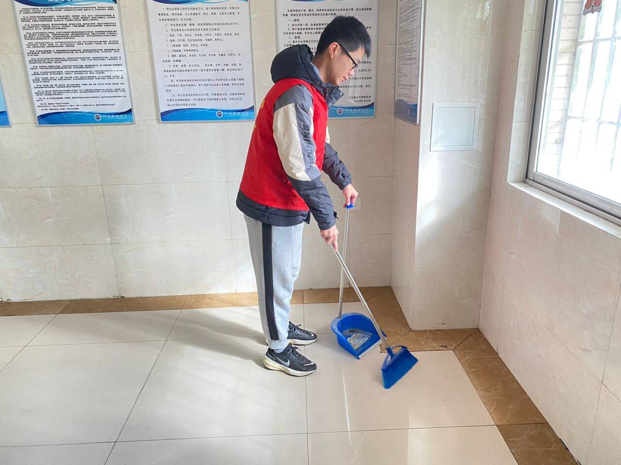 在宿舍楼道,志愿服务队员拿起扫帚抹布,清扫一砖一瓦,走廊、楼梯、自助厨房,都有他们忙碌的身影。队员们还自发深入宿舍加强宣传教育,提高同学们的环保意识,提醒同学们保持良好卫生习惯,共同维护公共区域的良好环境。