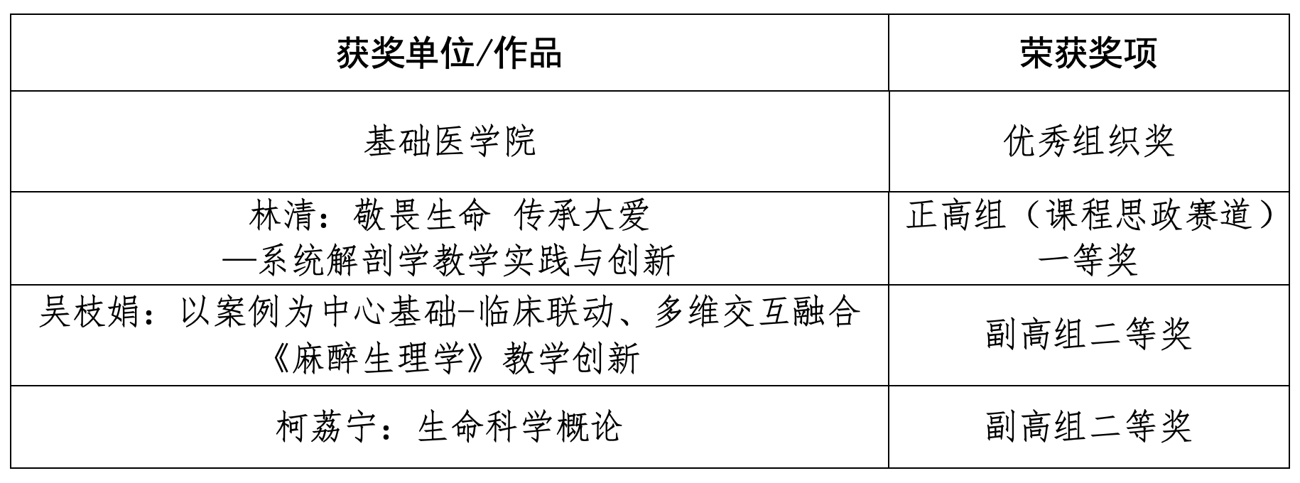 前期经各学系教师报名参赛,公司组织专家选拔和指导,推荐5名教师参加本次校赛。公司组织校外专家组网络评审,综合课堂教学实录视频、课程教学创新成果报告成绩之和总排名,公司共有3位教师进入校赛现场评审环节。经过激烈角逐,公司人体解剖学系林清教授获正高组(课程思政赛道)一等奖,生理学与病理生理学系吴枝娟副教授、人体解剖学系柯荔宁副教授获副高组二等奖,公司荣获优秀组织奖。