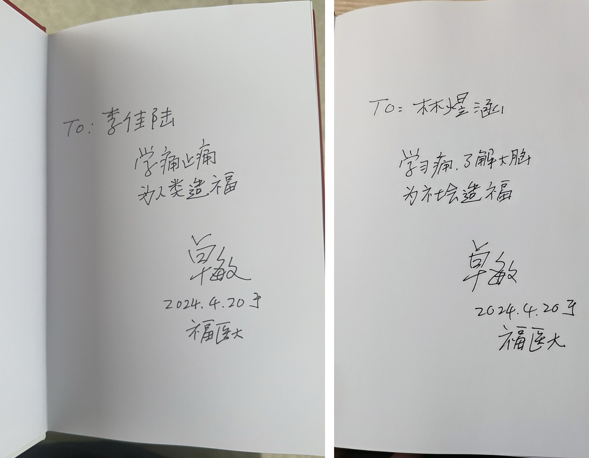 卓敏院士围绕痛觉产生机制、痛觉调制、疼痛和情绪的关系三部分展开授课,并和同学们分享了疼痛领域最新科研成果和脑科学研究的科研方法。讲座深入浅出,现场气氛热烈。在互动环节,在场师生踊跃提问,积极交流,卓院士还为同学们赠送了主编的新书《CHRONIC PAIN: New Molecular insights into Pain and Treatment》并签名勉励。