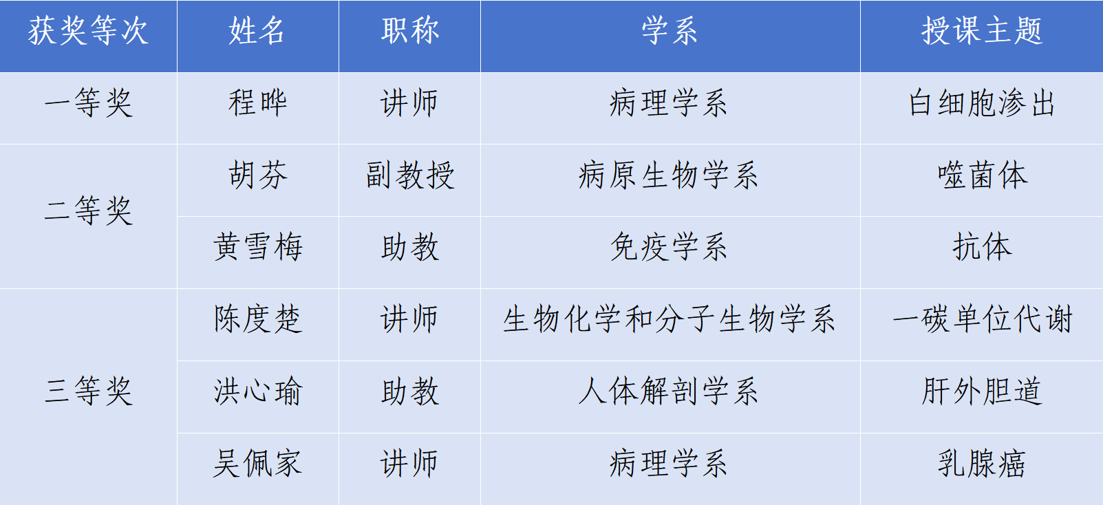 比赛最终成绩由教案评分、课题教学评分和教学反思三部分组成,并根据总成绩高低排序。经过激烈的角逐,本次比赛产生了一等奖1名、二等奖2名和三等奖3名(详细名单见附件)。根据比赛最终结果,推荐总成绩排序前3位的病理学系程晔讲师、病原生物学系胡芬副教授及免疫学系的黄雪梅助教参加校级青年教师基本功竞赛。最后,评委专家及公司领导为本次获奖教师颁发获奖证书。
