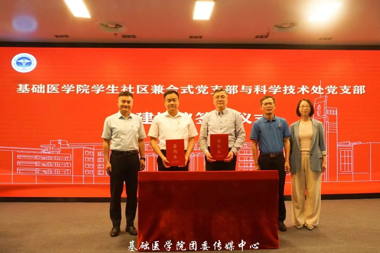 仪式伊始,郭书记代表社区支部与郑书记签署共建协议,双方将通过支部共建的形式,围绕党建引领、健康科普、科研诚信、创新创造、人才培养等多个方面开展活动,进一步服务员工社区建设与发展,增强育人实效。与会领导在台上共同见证这一激动人心的时刻。