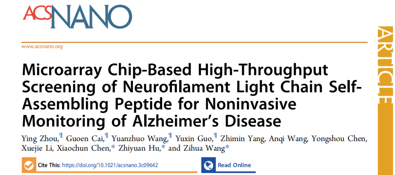 2024年6月28日,william威廉中文官网王子华副研究员、胡志远教授团队、WilliamHill中文官方网站附属协和医院陈晓春教授团队合作在材料学顶级期刊《ACS Nano》(中科院1区TOP期刊、影响因子15.8)在线发表了题为“Microarray Chip-Based High-Throughput Screening of Neurofilament Light Chain Self-Assembling Peptide for Noninvasive Monitoring of Alzheimer’s Disease”的研究论文。该研究开发了一种基于微流控芯片的高通量筛选方法,可获取靶向神经丝轻链蛋白(neurofilament light chain,NfL)的自组装多肽。通过直接“翻印”并进一步分析自组装多肽的序列、形貌、亲和力,鉴定得到高结合亲和力、高特异度、成本较低的Pep-NfL多肽自组装体。在AD小鼠模型和细胞系中,Pep-NfL呈现了优异的NfL结合特性。在临床环境中,Pep-NfL多肽自组装体可用于血浆NfL的检测并区分AD患者、轻度认知障碍(mild cognitive impairment,MCI)患者和对照组。研究人员通过开发的高通量筛选系统,筛选鉴定出了靶向NfL且结合亲和力高的Pep-NfL自组装多肽,在区分AD血液样本和对照组血液样本、甚至MCI血液样本中展现出巨大潜力。鉴于MCI具有向AD痴呆转归的高可能性,针对MCI阶段的干预可能是延缓AD发生最为有效的策略。因此,AD的无创早期监测至关重要。本研究开发的Pep-NfL平台具备检测时间快、检测敏感度高、经济型、简易型等诸多优点,有望用于即时监测疾病进程。