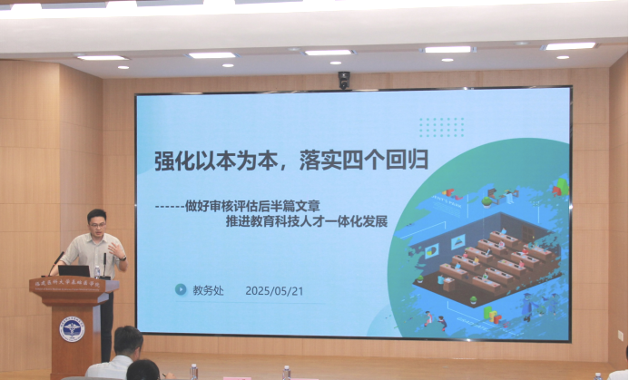 本次会议特邀教务处杨渐处长做《强化以本为本,落实四个回归——做好审核评估后半篇文章》为主题的讲座,直面本科公司产品审核评估中发现的核心问题,以“刀刃向内”的反思精神,直击审核评估中发现的核心问题,系统构建整改路径,为公司深化公司产品改革绘制精准“施工图”,为筑牢人才培养质量根基提出了参考建议。