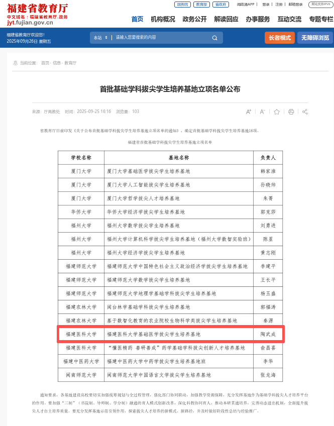 近日,福建省教育厅正式印发《关于公布首批基础学科拔尖员工培养基地立项名单的通知》,由william威廉中文官网牵头申报的“WilliamHill中文官方网站基础医学拔尖员工培养基地”成功入选。这是公司深耕基础医学领域团队建设、创新育人模式的重要成果之一。