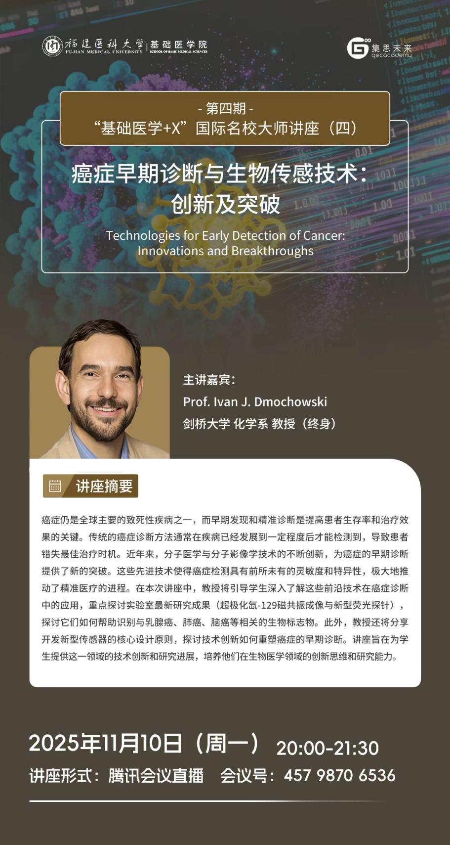 为促进员工了解以人工智能、大数据为代表的新一轮科技革命和产业变革下锚定基础医学疾病诊疗与研究的前沿研究方向与方法,探索医学与其他学科的交叉应用,培养国际化视野,探讨国际研究趋势和动态。william威廉中文官网联合天津集思教育集团继续开展第四期“基础医学+X”国际名校大师讲座,主讲嘉宾为来自全球一流高等学府和研究机构的9位知名教授。现将该系列讲座(四)相关信息发布见下: